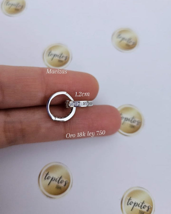 Candongas 1.2cm macizas, con zircones, Oro Blanco 18k ley 750
